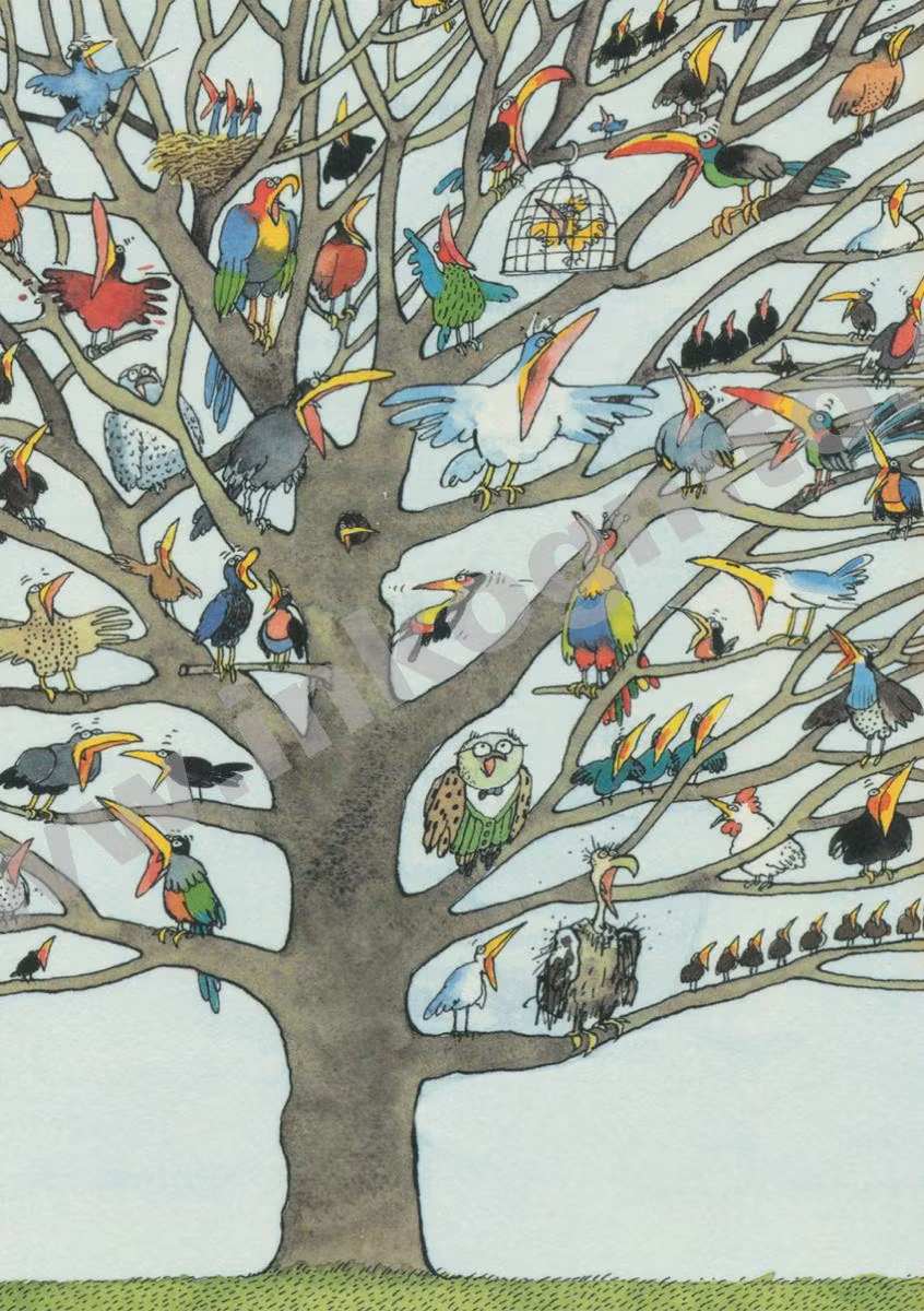 Här tas det i ändå från tårna! Det gäller att låta rösten göra sig hörd om man vill överglänsa de andra sångarna i detta musikaliska träd. Många underbara detaljer att titta på.