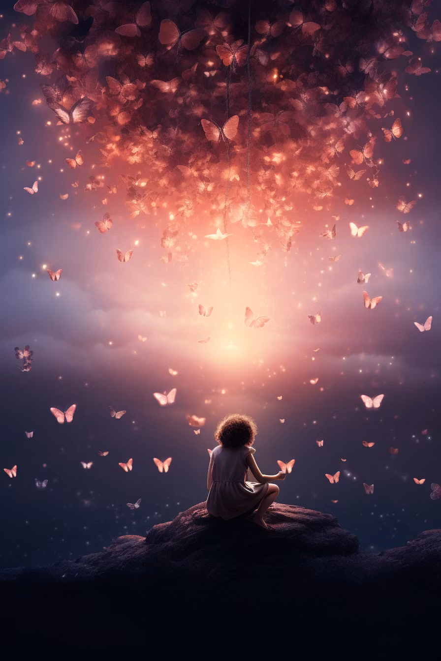 Underbart vykort med barnet som sitter så stilla i det vackra ljuset. Omgiven av fjärilar. Kortet är lite extra fint eftersom det har rundade hörn.