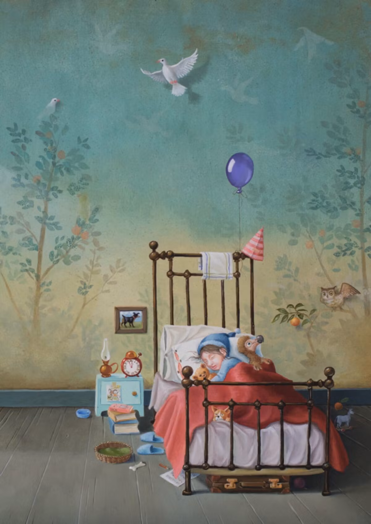 Här sover det lilla barnet. Kanske är det dagen efter kalaset? Kalashatten hänger på sängen och ballongen svävar ovanför sängen. Eller är det drömmar om den kommande födelsedagen?