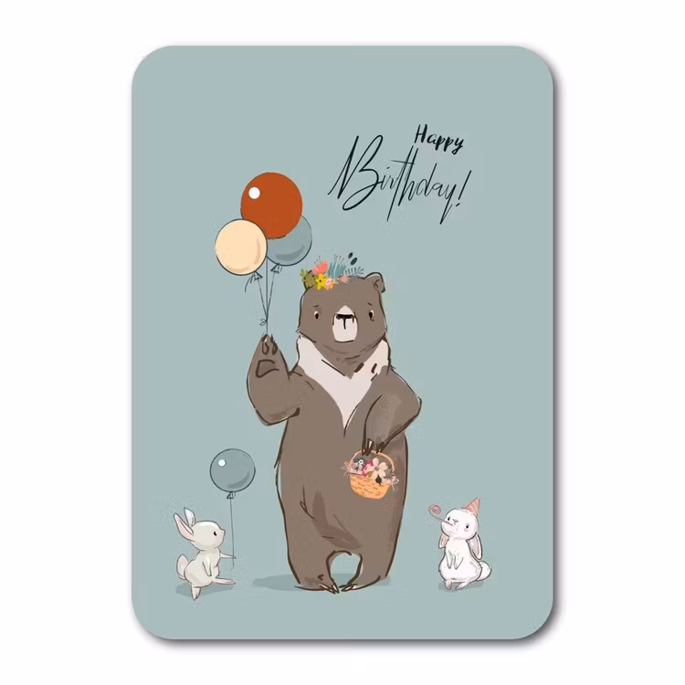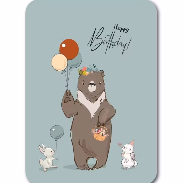Stort grattis på födelsedagen önskar Björn och kaninerna. På kortet står det Happy Birthday.