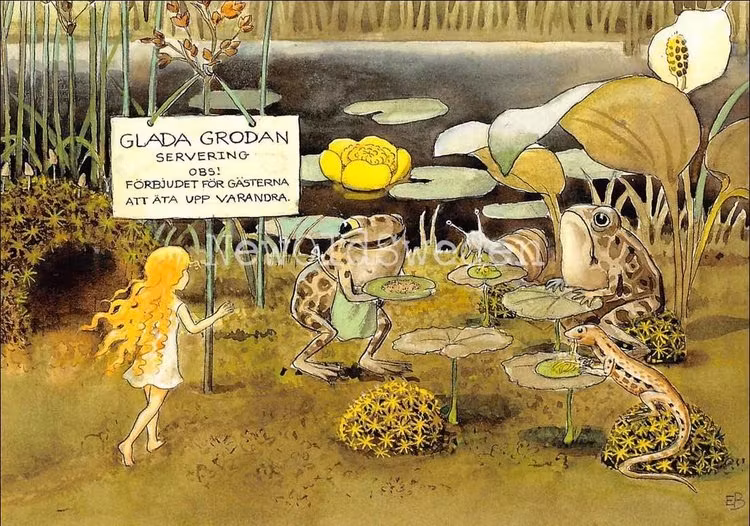 Underbart kort från boken Solägget. Här ser vi grodornas servering nere vid dammen.