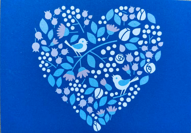 Vackert hjärta med blommor och fåglar i blå toner. Kortet är av vykortsstorlek. Enkelt kort med plats för adress och frimärke på baksidan. Inget kuvert.