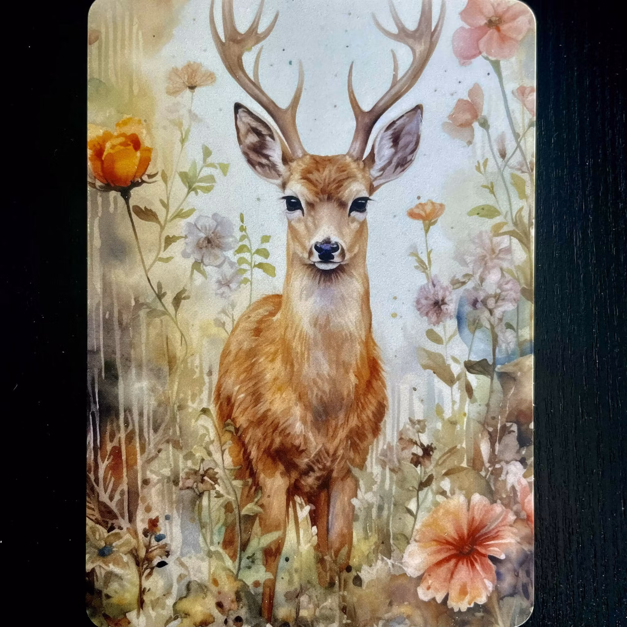 Så vackert kort med hjorten som står i gläntan, bland de vackra blommorna, och tittar mot mottagaren av kortet.