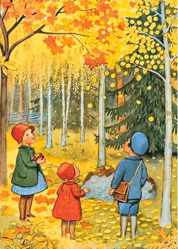 Underbart vackert kort med barn ute i skogen, en vacker höstdag.Kortet är i vykorts storlek. Enkelt kort med plats för adress och frimärke på baksidan.
