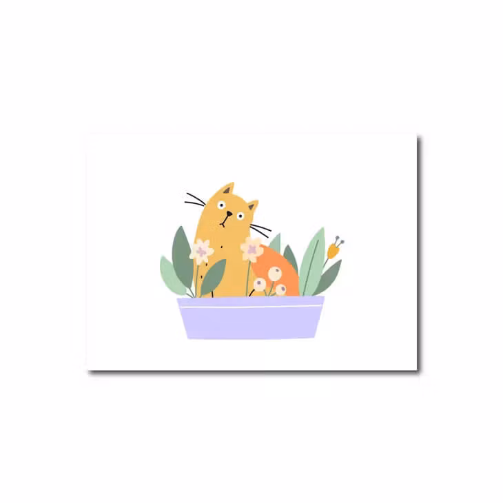 Härligt kort med den söta katten sittandes i en blomsterkruka.