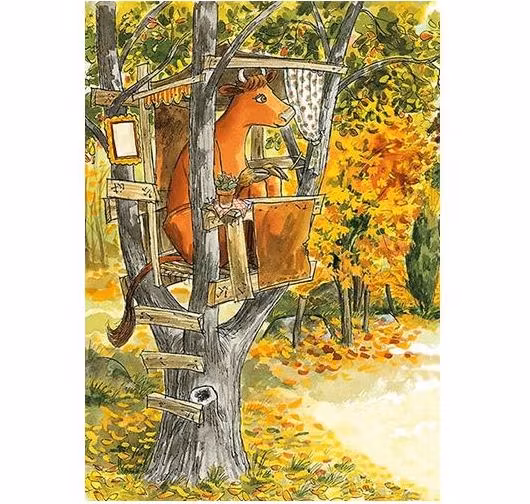 Här har Mamma Mu byggt en koja högt uppe i ett träd. Tänk så mysigt det måste vara att sitta där uppe och titta på allt som händer ute i naturen.