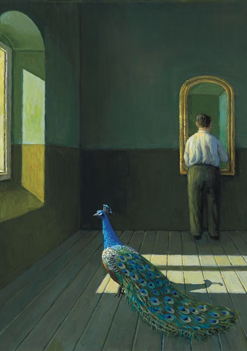 Mannen står vid spegeln och försöker förtvivlat göra sig lika fin som sin vän Påfågeln. Återstår att se om han lyckas.