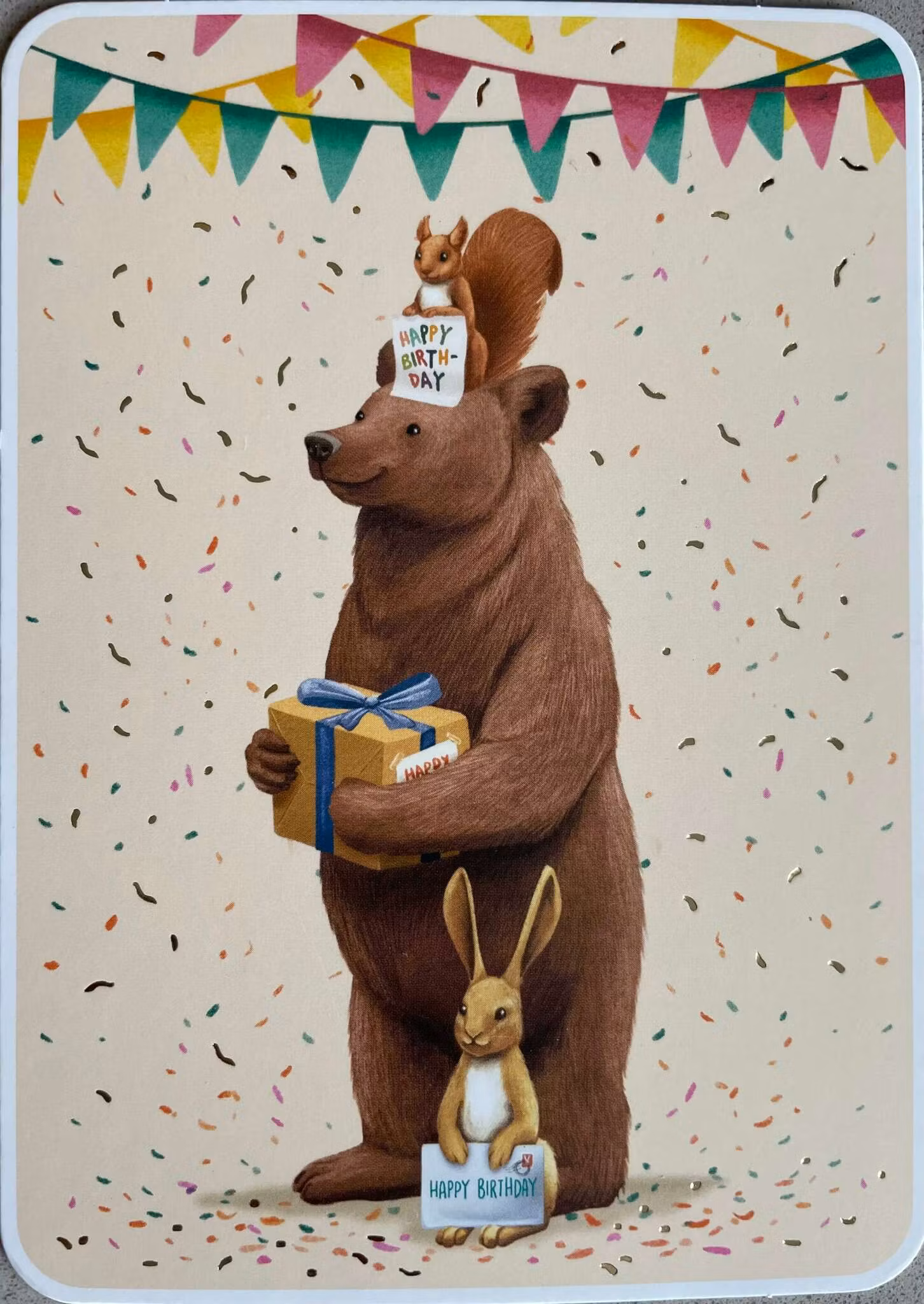 Enkelt Kort med gulddetaljer- Björnens, ekorren och harens grattis (Fraktfritt)
