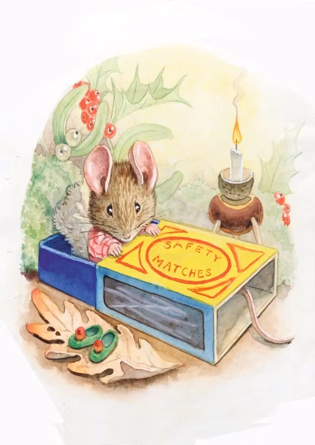 Så fint litet kort med den lilla musen som krupit ner i tändsticksasken för att sova.
