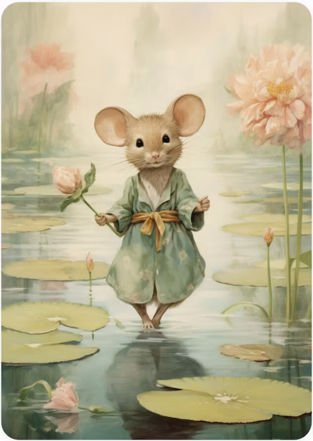 Underbart vackert kort med den lilla musen som står så fridfullt bland de vackra näckrosbladen.