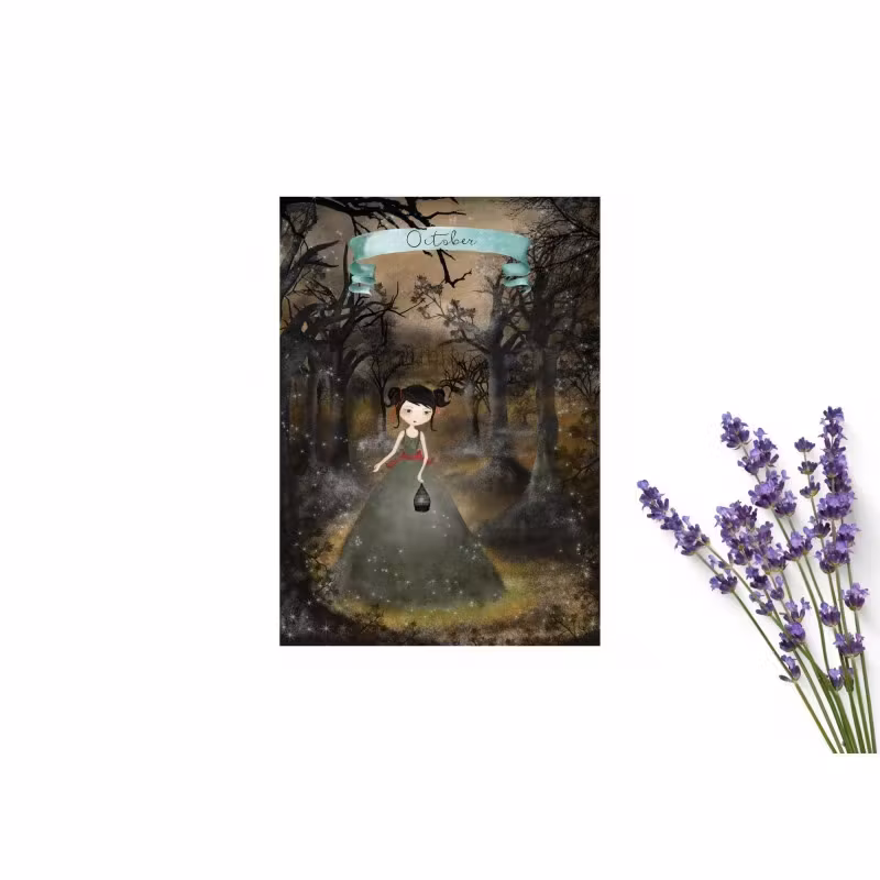 Härligt kort med den söta flickan en oktoberdag. Vykortsstorlek. Tryck på båda sidor. Handgjort i Grekland.