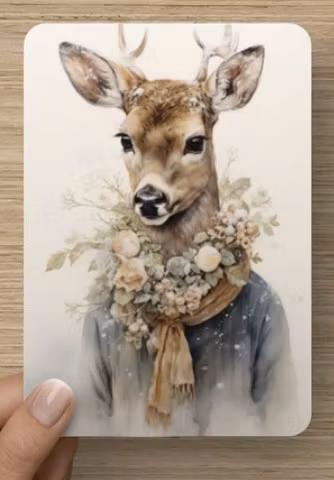 Ett vackert kort med rådjuret med de vackra blommorna runt halsen. Kortet är lite extra lyxigt eftersom det har rundade hörn.