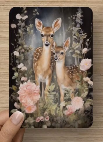 Ett vackert kort med rådjur mot mörk bakgrund. Kortet är lite extra lyxigt eftersom det har rundade hörn.