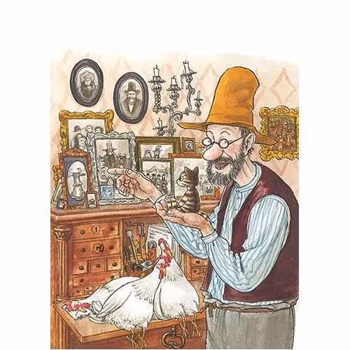Här står Pettson och visar Findus alla fotografier på släkt och vänner. Bild från När Findus var liten.