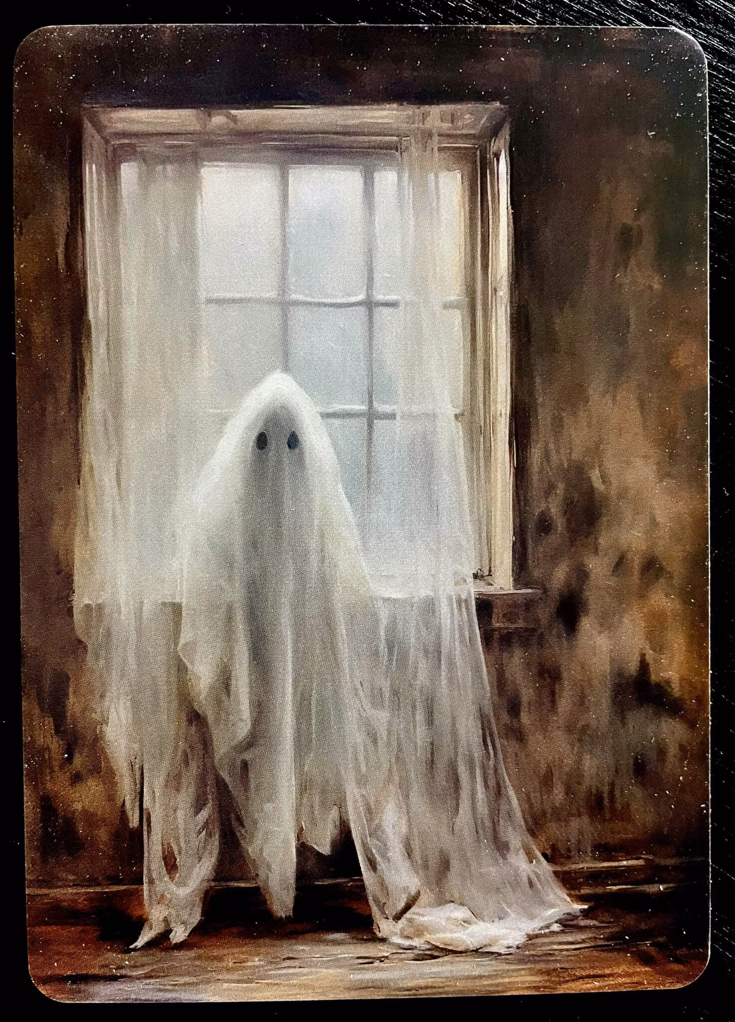 Underbart vykort med spöket som står gömd bland de skira gardinerna. Kortet är lite extra fint eftersom det har rundade hörn.