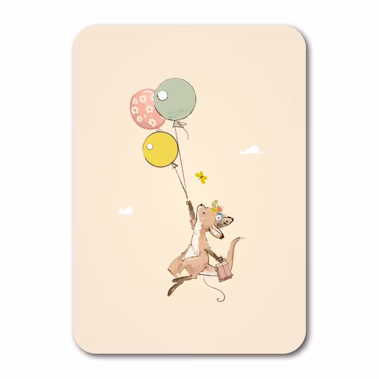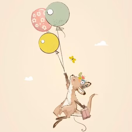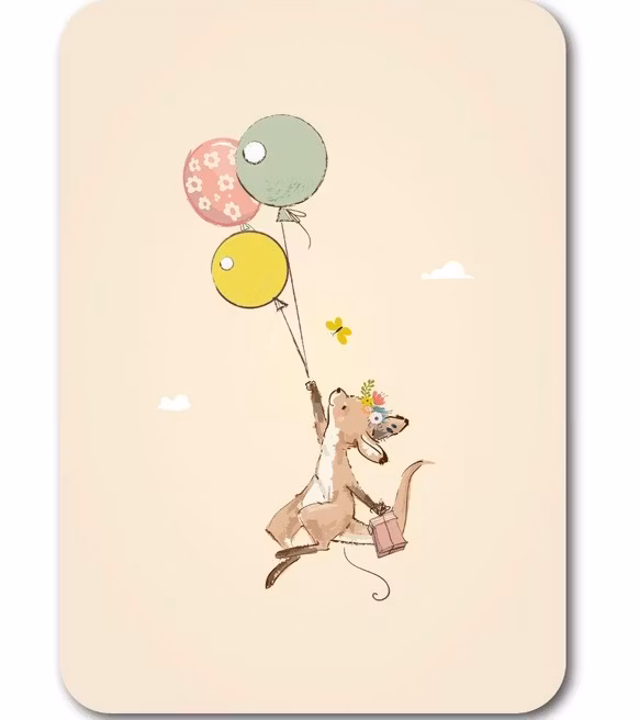 Oj, här bär det iväg upp i skyn med ballonger, paket och allt. Den lilla kängurun hänger med och tycker det är härligt. Kanske kommer hon först till kalaset nu?