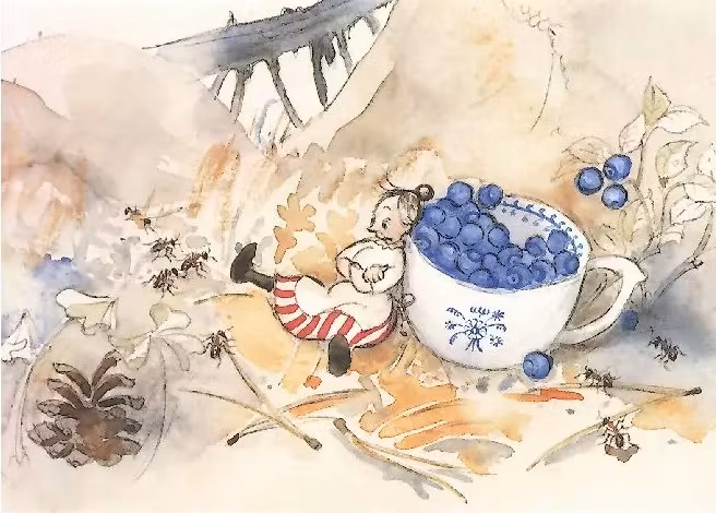 Här sitter gumman som blir liten som en tesked bredvid en stor kopp full med blåbär. Vykortsstorlek. Enkelt kort med plats för adress och frimärke på baksidan.