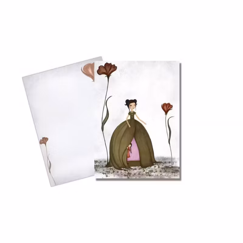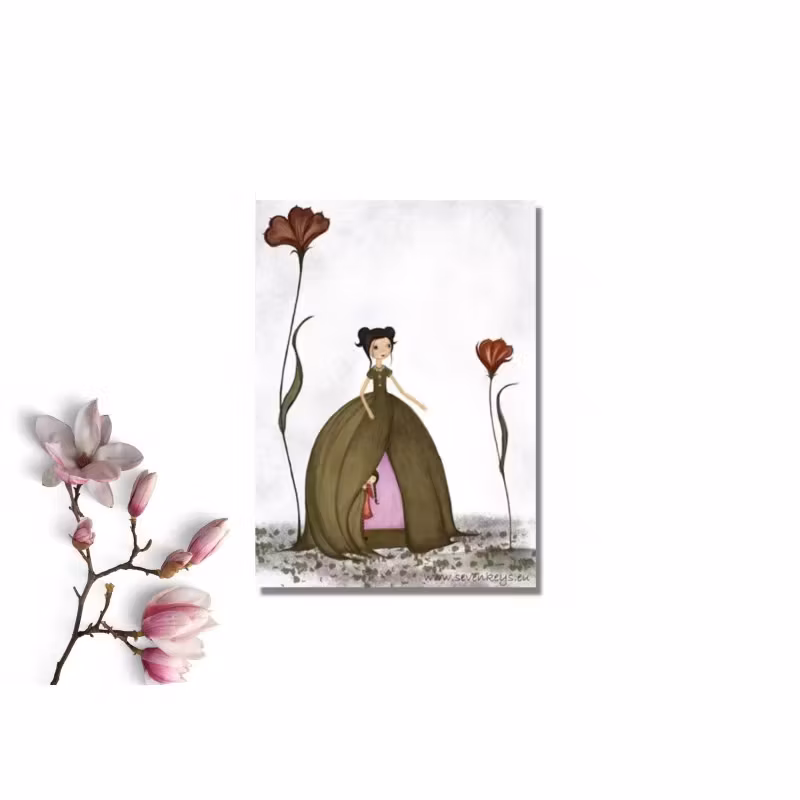 Härligt kort med den söta flickan en vårdag. Titta, där tittar någon ut från klänningen!