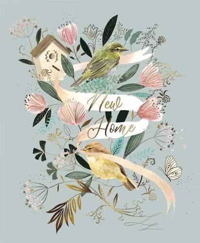 Underbart vackert kort med växter och vackra små fåglar som välkomnar till det nya hemmet. På kortet finns texten ”New Home”. Passande kuvert medföljer.