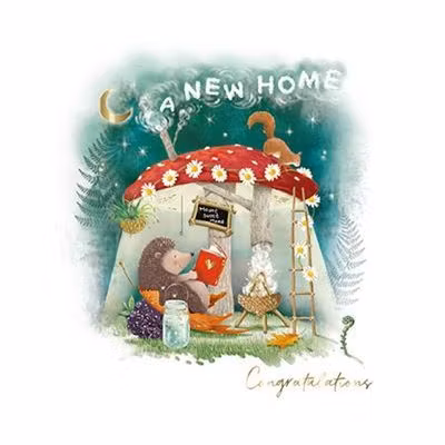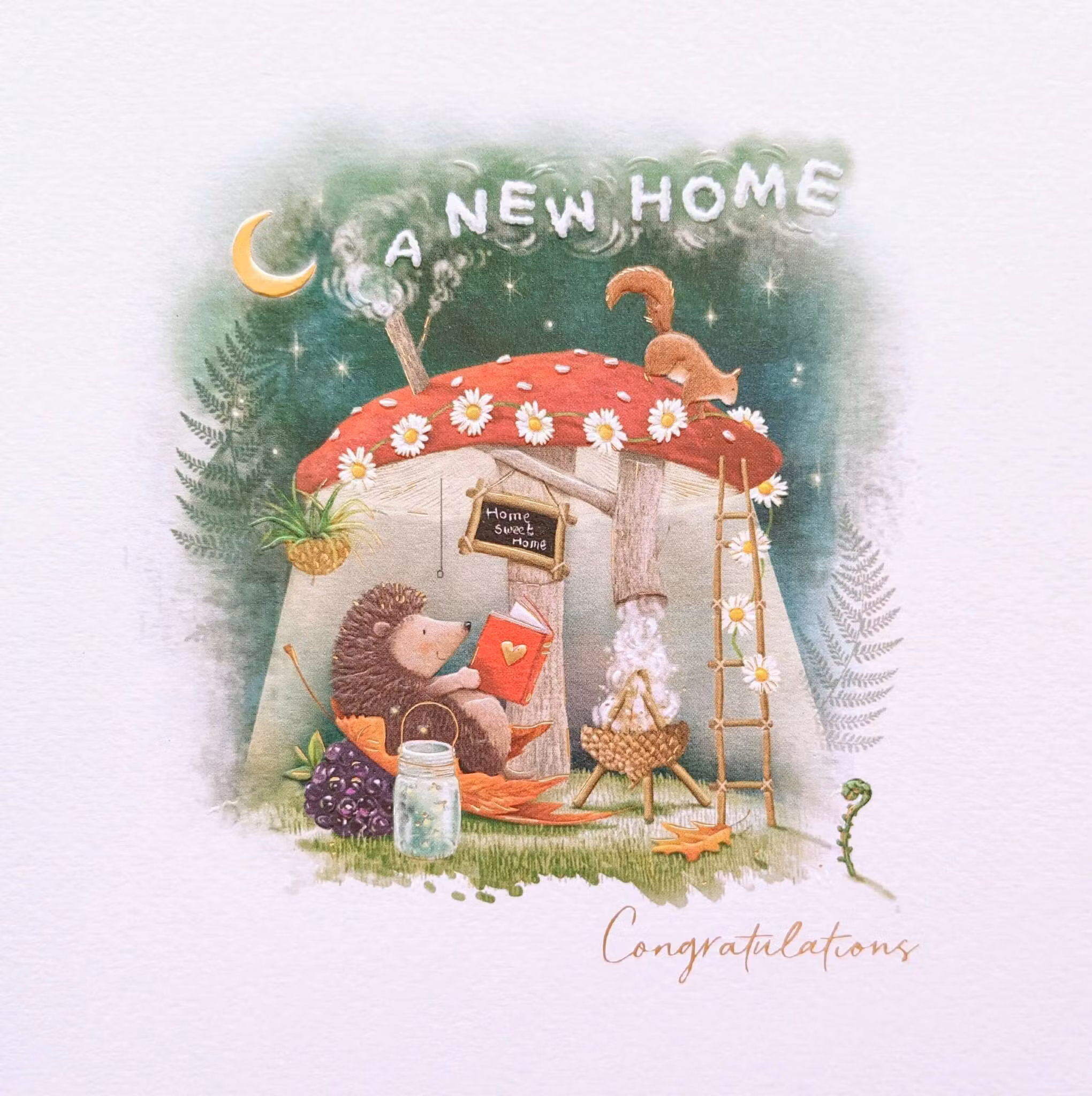 På kortet finns texten "A new home. Congratulations". Texen och vissa detaljer på kortet är förhöjda med guld för en extra lyxig känsla.
