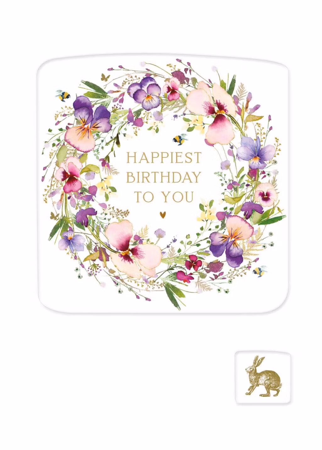 Underbart grattiskort med vacker lilarosa blomsterkrans.