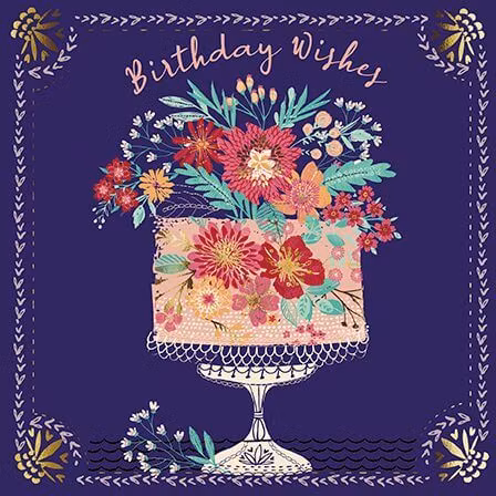Ett härligt kort med en vackert blomstrande födelsedagstårta ståendes på ett tårtfat.