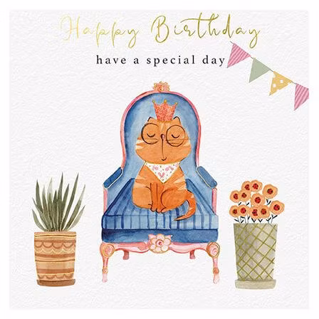 Ett härligt kort med katten sittandes på sin tron, redo att bli firad hela dagen lång.