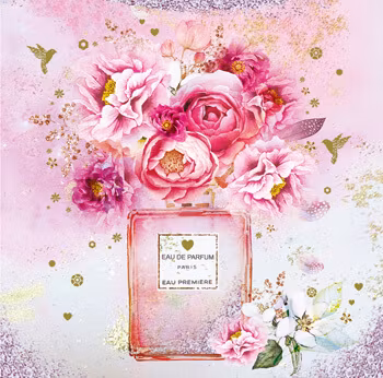 Härligt kort med underbara blommor som kommer ut från en parfymflaska.