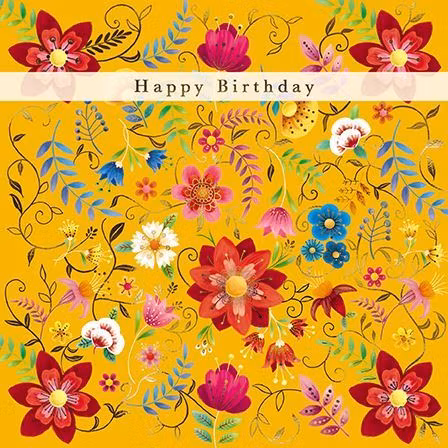Härligt kort med de färgglada blommorna mot den gula bakgrunden. På kortet finns texten "Happy Birthday". I kortet finns texten "Have a lovely day".