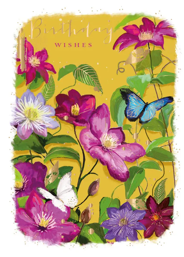 Härligt kort med rosalila blommor och vackra fjärilar. Allt mot en varmgul bakgrund.