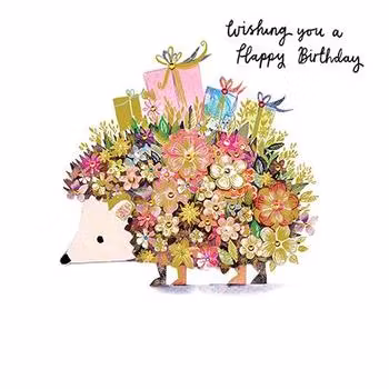Underbart grattiskort med blomsterdekorerad igelkott med paket. På kortet finns texten ”Wishing you a Happy Birthday”. Kuvert medföljer.