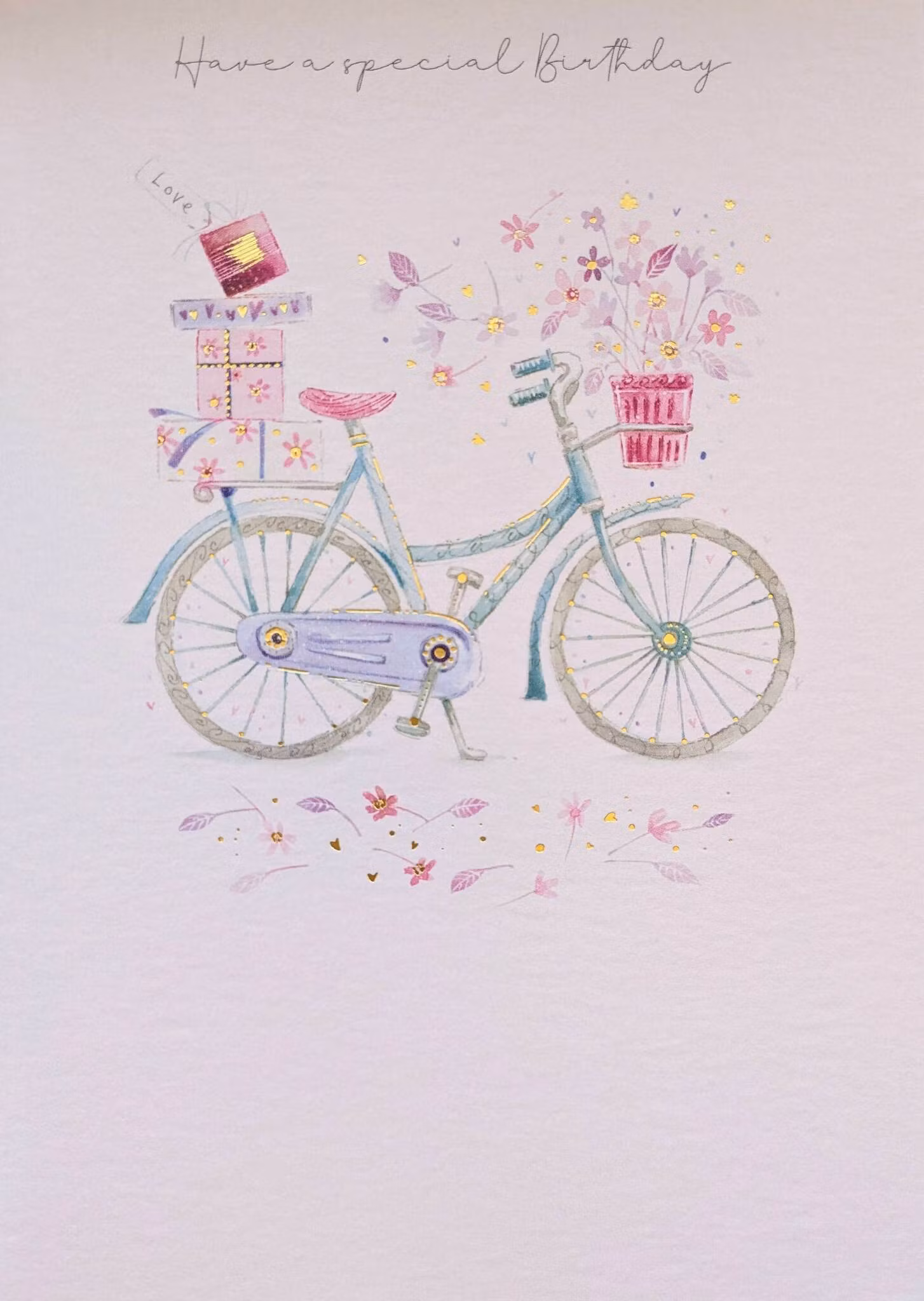 Härligt kort med en cykel som kommer med både presenter och blommor. På kortet finns texten "Have a special Birthday". Det medföljer ett passande kuvert.
