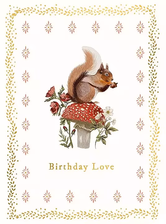 Fint kort med den söta ekorren som sitter på en flugsvamp. På kortet finns texten "Birthday Love". Vissa detaljer på kortet är förstärka med guld. Kuvert ingår.