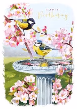 Underbart grattiskort med söta fåglar vid fågelbadet, omgivna av körsbärsträd.