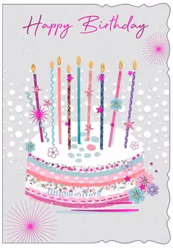 Underbart grattiskort med härlig tårta dekorerad med 12 färgglada ljus.