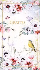 Underbart grattiskort med vackra, rosa blommor och en fågel som sjunger så glatt under firandet.