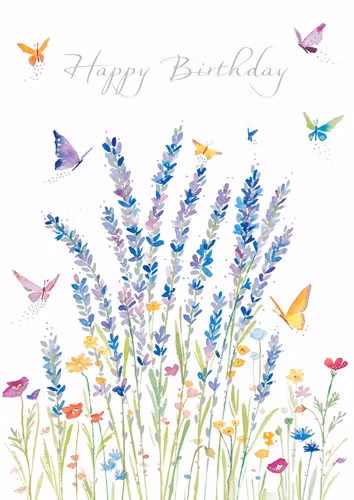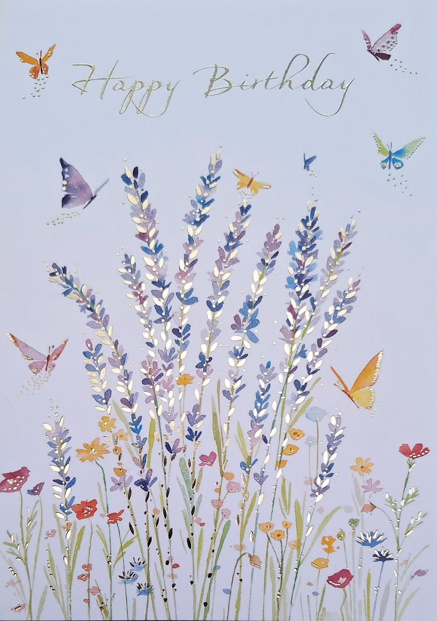 Underbart grattiskort med härliga lavendelblommor och vackra fjärilar. På kortet finns texten ”Happy Birthday”. Kuvert medföljer.