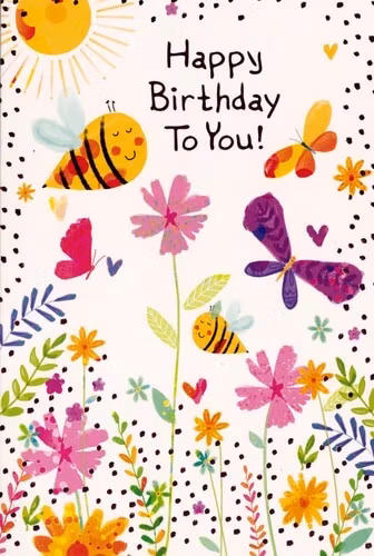 Underbart kort med härlig sommarkänsla. Vackra blommor, glada bin och fjärilar. Över hela bilden lyser en härligt, skinande sol.