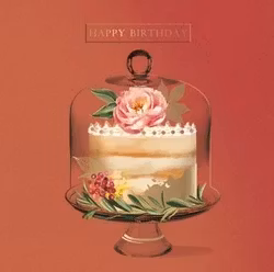 Härligt kort med vacker tårta i en glaskupol. Tårtan har en vacker ros på toppen.