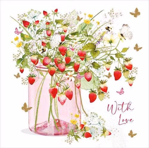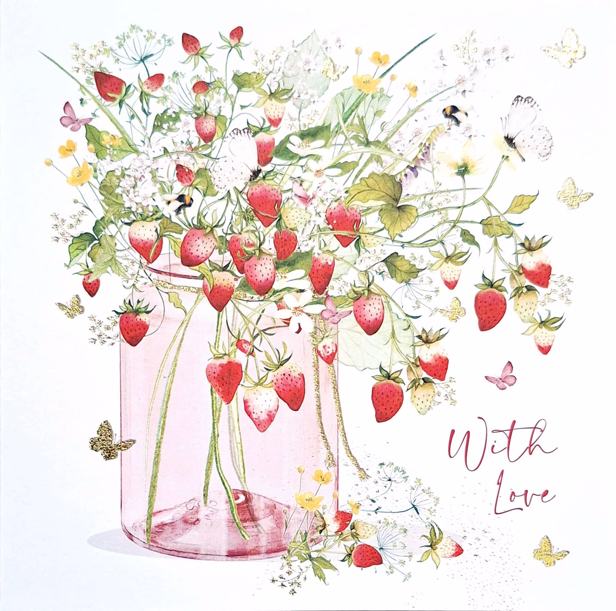 Underbart kort med fjärilar runt vas fylld av mumsiga jordgubbar som hänger i klasar från sina plantor.