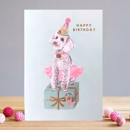 Ett härligt turkost kort med pudeln som sitter i sin fina mössa på det inslagna paketet. På kortet finns texten "Birthday wishes".