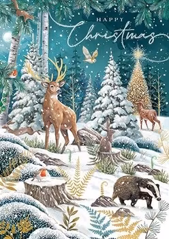 Underbart kort med de vackra skogsdjuren i vinterskogen. På kortet finns texten "Happy Christmas".
