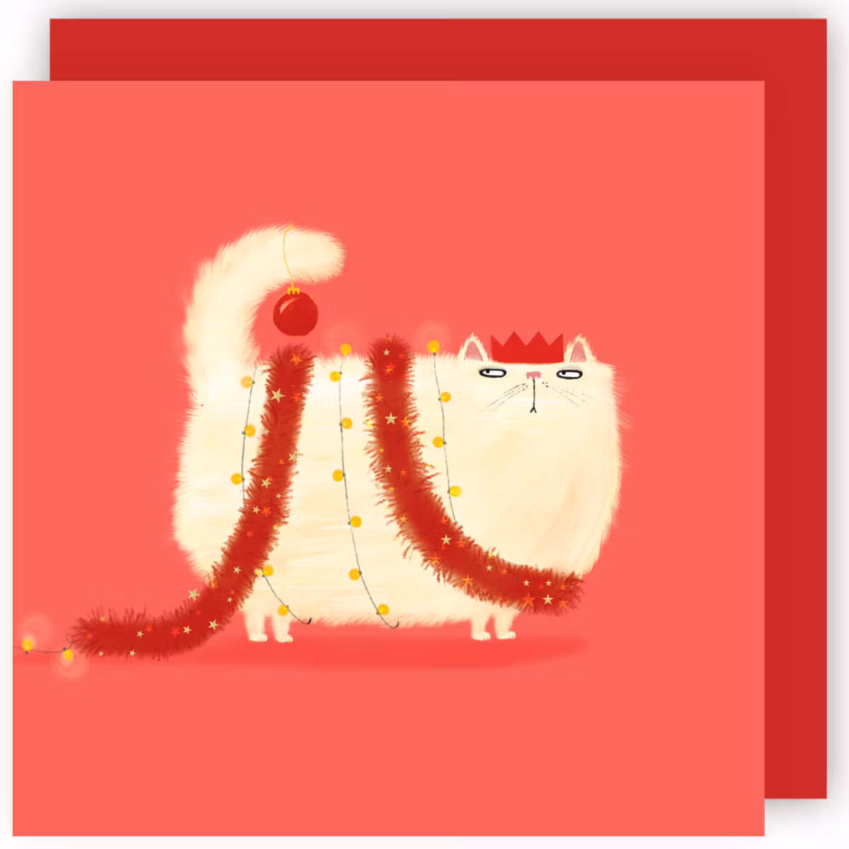 Underbart julkort med den fina katten dekorerad i med både girlang och krona.