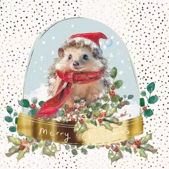 Underbart julkort med igelkotten som är klädd i halsduk och mössa i en vacker snöglob. På kortet finns texten "Merry Christmas".