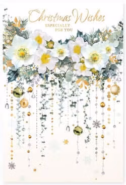 Underbart kort fullt med vackra vita blommor som hänger ner över hela kortet. På kortet finns texten ”Christmas Wishes especially for you”.