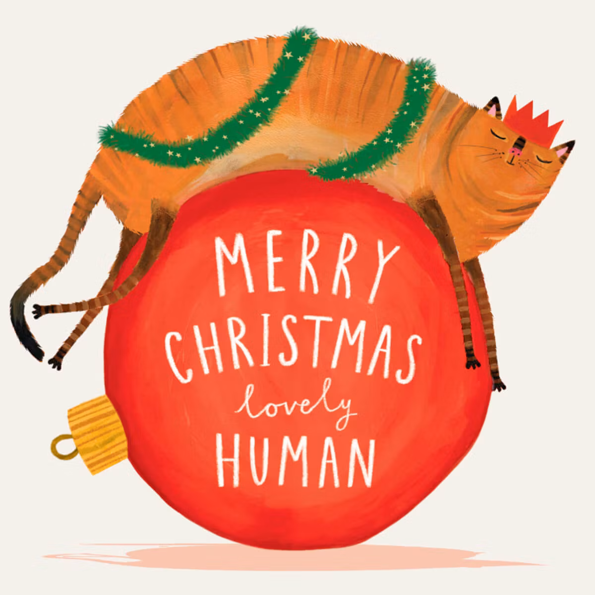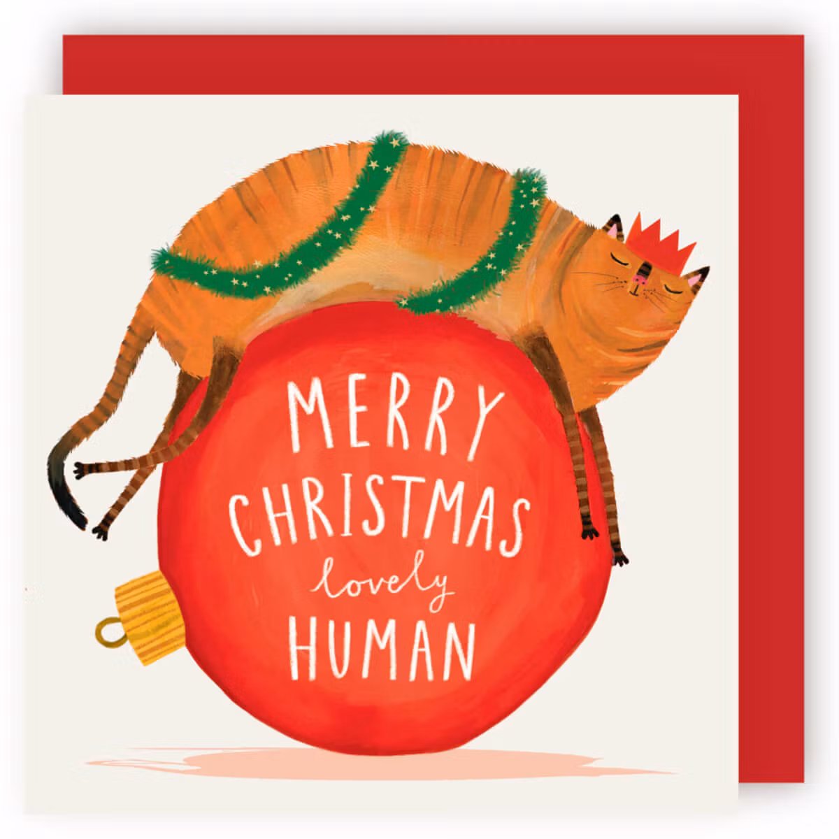 Underbart julkort med katten som har somnat på toppen av julgranskulan. På julgranskulan finns texten "Merry Christmas lovely human".