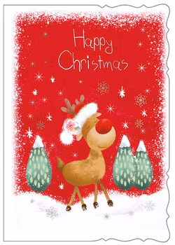 Underbart kort med renen som myser i snön. Inte undra på det. Snart är ju julen här!