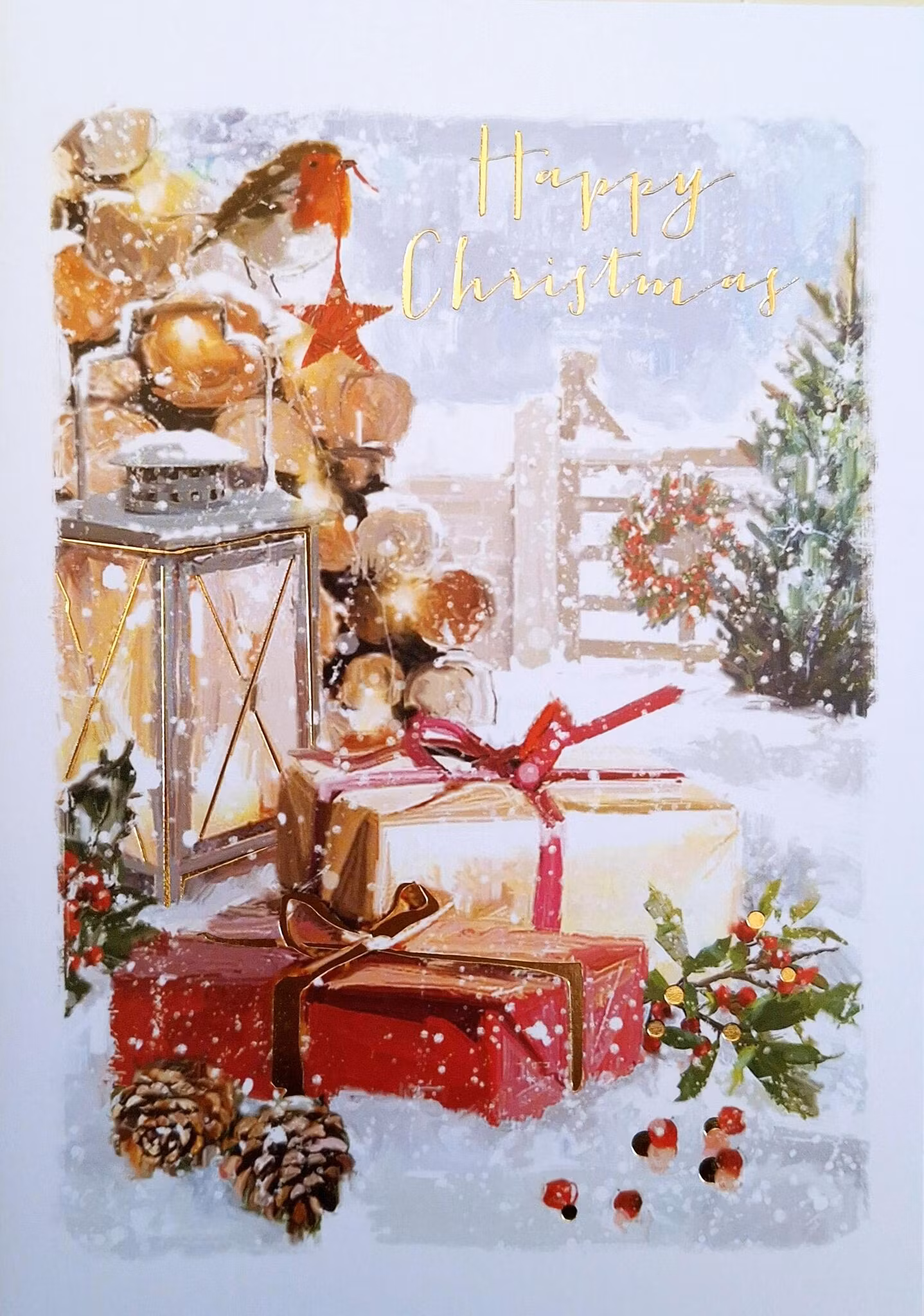 Underbart kort med de vackert inslagna paketen som ligger i snön vid lyktan. På kortet finns texten ”Happy Christmas”. Kuvert medföljer.