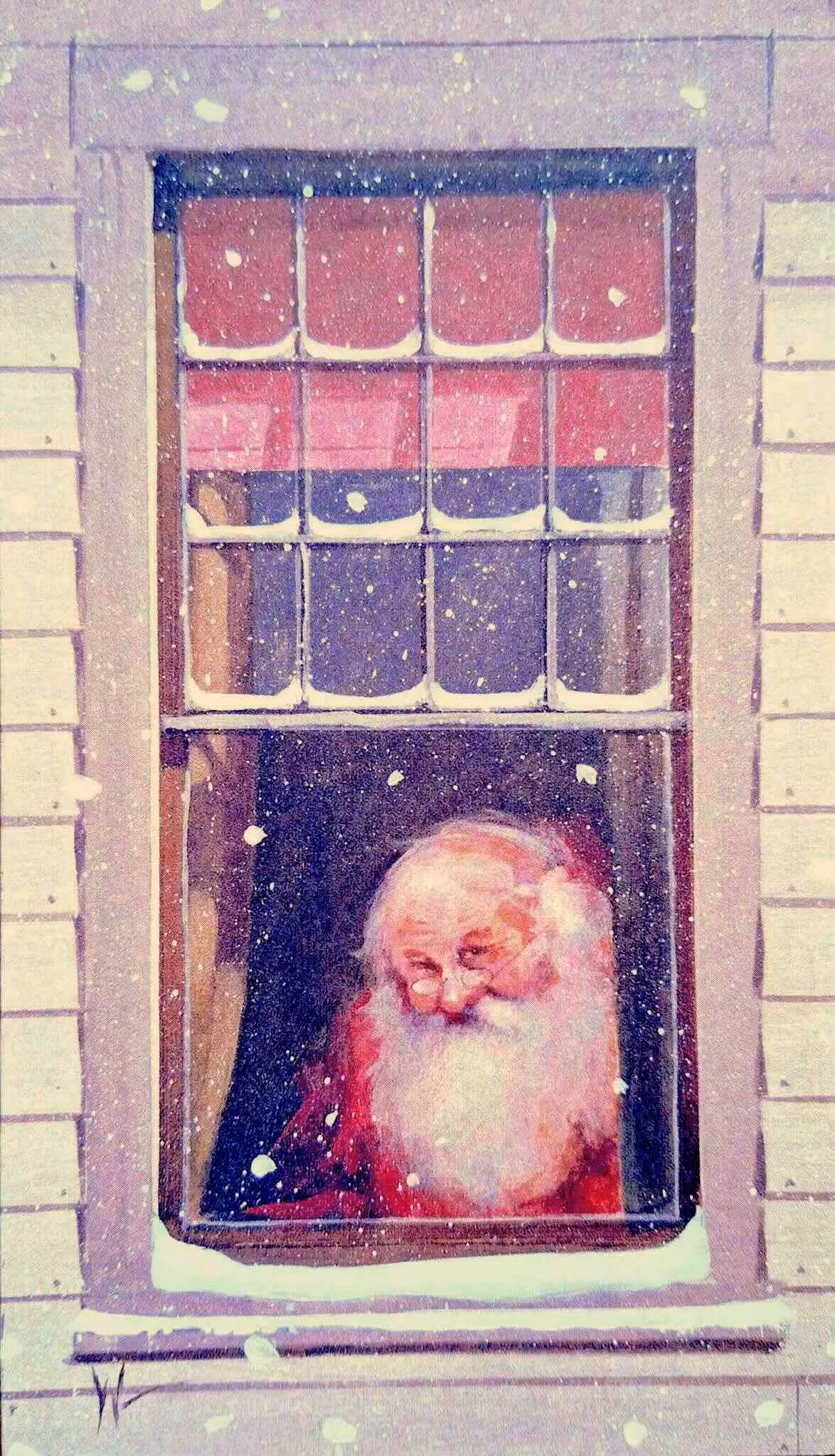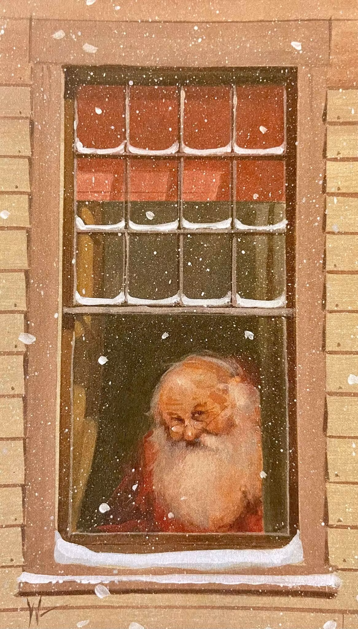 Julkort med tomten som tittar ut genom sitt öppna fönster.