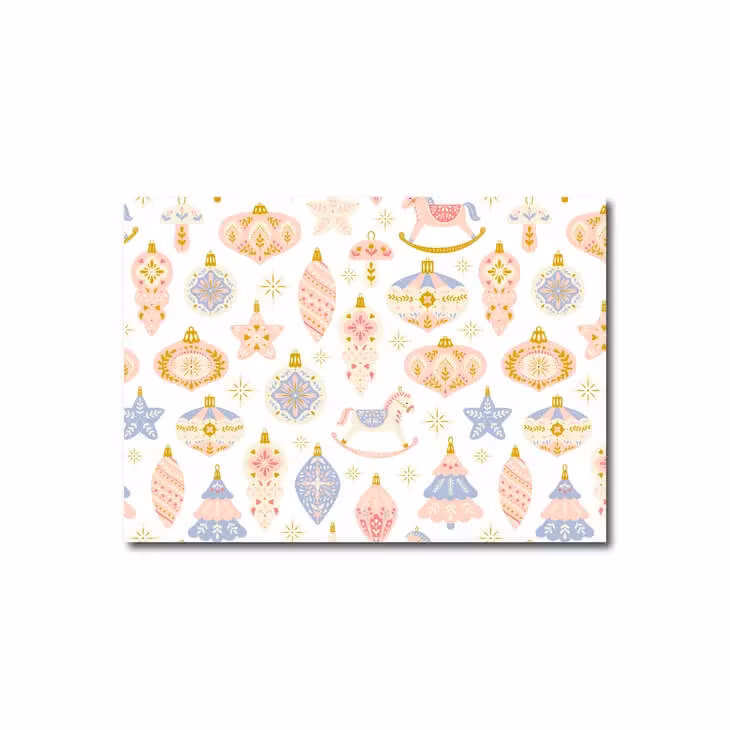 Härligt kort med vackert mönster av julgranspynt i pastellfärger.
